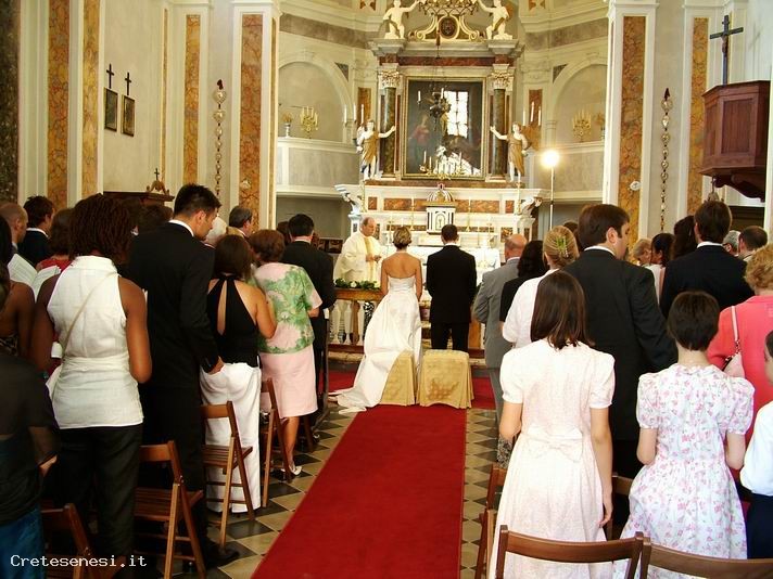 The church of San Giovanni Battista is a sacred building in Modanella (Rapolano Terme). Already a Piccolomini patronage, Pio II transferred here the ancient cure of saint Lucia in Castelvecchio. The classical front and the bell tower in bricks and travertine date back to the restoration made at the beginning of the XIX century. The inside has kept the seventeenth-century furnishings. On the altar on the right there is a painting with the “Supper in Emmaus”, probably by Raffaello Vanni; the altar on the left, on the contrary, held a splendid painting of the Florentine school of the half of the XVI century which has been stolen; on the main altar there is a wooden crucifix on a canvas with the Virgin Mary, Saint Giovanni and Maria Maddalena of 1657, very venerated, to which it is dedicated the Indulgence Feast with the procession on the first Friday of March.