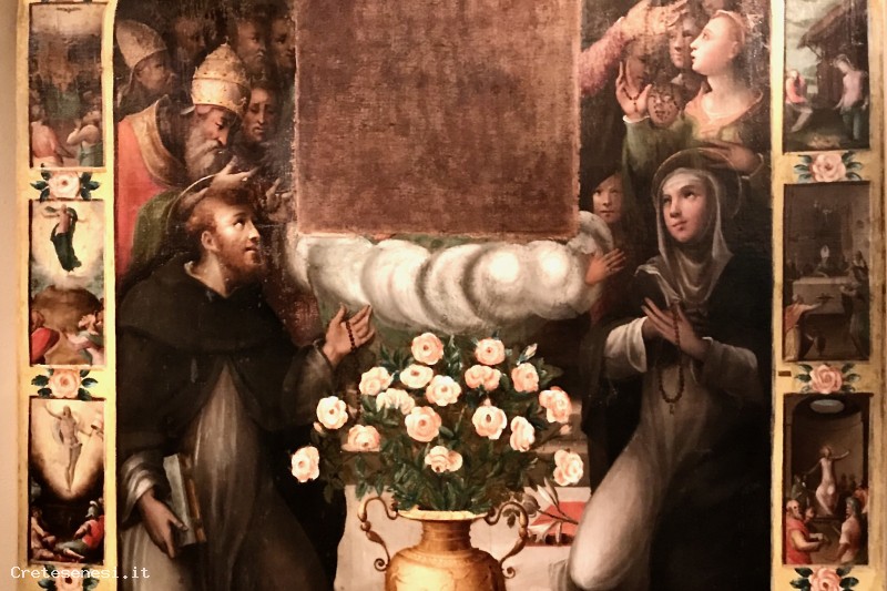 In addition to Saint Dominic and Saint Catherine in the central part of the canvas, there is a frame that runs throughout the painting, the sections of which are read starting from the one in the upper right and continuing clockwise.