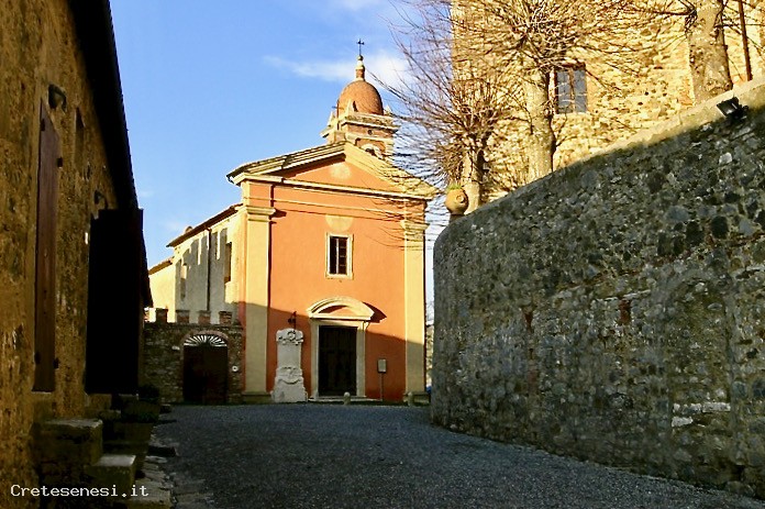 The church of San Giovanni Battista is a sacred building in Modanella (Rapolano Terme). Already a Piccolomini patronage, Pio II transferred here the ancient cure of saint Lucia in Castelvecchio. The classical front and the bell tower in bricks and travertine date back to the restoration made at the beginning of the XIX century. The inside has kept the seventeenth-century furnishings. On the altar on the right there is a painting with the “Supper in Emmaus”, probably by Raffaello Vanni; the altar on the left, on the contrary, held a splendid painting of the Florentine school of the half of the XVI century which has been stolen; on the main altar there is a wooden crucifix on a canvas with the Virgin Mary, Saint Giovanni and Maria Maddalena of 1657, very venerated, to which it is dedicated the Indulgence Feast with the procession on the first Friday of March.