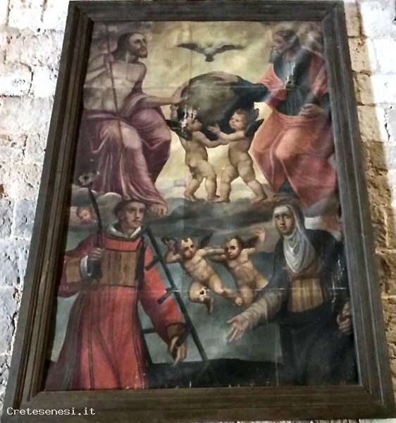 On the right, Saint Catherine of Siena, in Benedictine habit, holds a lily, which is also one of her iconographic symbols.