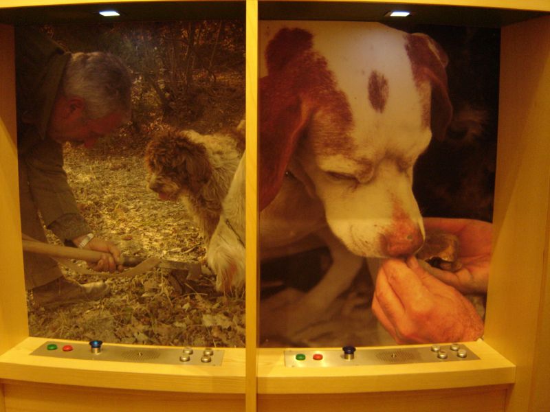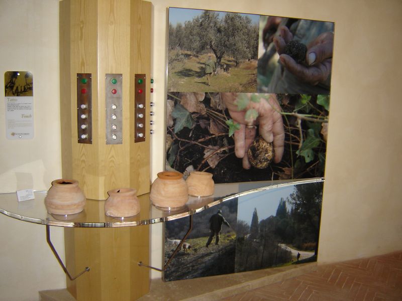 In San Giovanni d’Asso, a natural bridge between the Crete senesi and the Val d’Orcia, rich in farmhouses, lanes and castles, it has been recently inaugurated the first Italian museum of the truffle. The scenary of this intervention are the undergrounds of the fourteenth-century castle of San Giovanni , 250 square metres for a journey which starts with a sounding of the European culture. It is just the “truffle’s mystery”, fed by witchcraft, science and erotic, the first theme which is tackled during the life’s path: from the legend which says that it was originated by a thunderbolt to the real scientific definition, the visitor catches soon the historical moments in which the esteemed tuber has been famous in the western society. Then, we found the first involving sensorial experiences offered by the museum, in a continuous game through patterns of which the protagonist is the touch, to look into some jars; the hearing, distinguishing the footprints of the dog or the noise of the spade; the taste through little tastings and finally the so-called “odorama”, the real merry-go-round dedicated to the sense of smell. To the sight is reserved a human dimension-reconstruction of the truffle itself, accompanied by multimedia contributions to the natural habitat; such technologies enrich also the last section of the museum, a cooking curriculum which reproduces a farm canteen and a high-middle class one and looks into the techniques of collection, preservation and use in cooking. At the end of the pattern there is the information centre wher you can find interactively several knowledge which are implicit in the visit, thanks to the interesting teaching-laboratories.