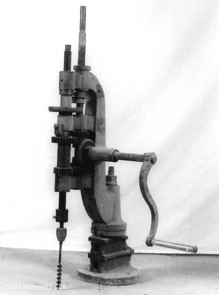 Un trapano di questo genere veniva piazzato normalmenrte su un banco che serviva come piano di appoggio per la foratura.
