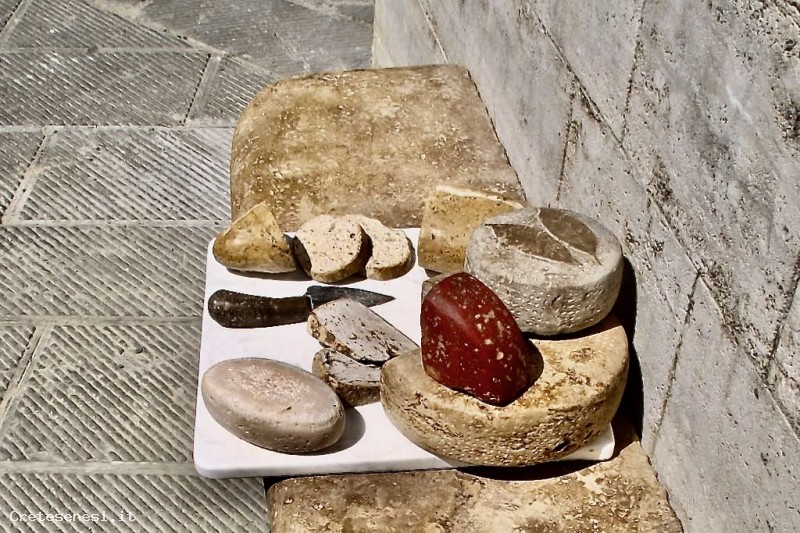Questo particolare e piccolo monumento ai prodotti locali, realizzato in travertino, è stato concepito come momento contemporaneo di valorizzazione di prodotti alimentari d'eccellenza e dei travertini disponibili in zona, per la realizzazione di piccole e sofisticate opere d'arte.