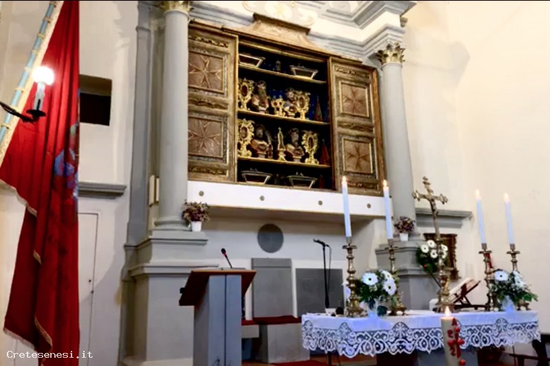 Le reliquie donate dal cardinale Ricciardo Petroni furono sistemate sopra l'altare maggiore entro un armadio secentesco ad ante lignee dipinte, che si apre ogni anno il sabato che precede la domenica in albis. Viene tirato a sorte il nome di un santo, la cui reliquia verrà portata in processione il giorno successivo, e quindi riposta; alla chiusura delle ante il loro scricchiolio rappresenterà un buon auspicio per il raccolto annuale della campagna (festa cosiddetta "dello scricchio").
