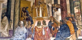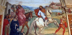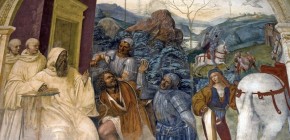 L’affresco che mostra la storia del Re Totila che vuole conoscere San Benedetto e manda a ...