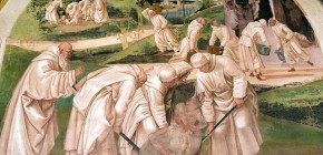 33 - Come Benedetto fa portare il corpo di Cristo sopra al monaco che la terra non voleva ricevere
