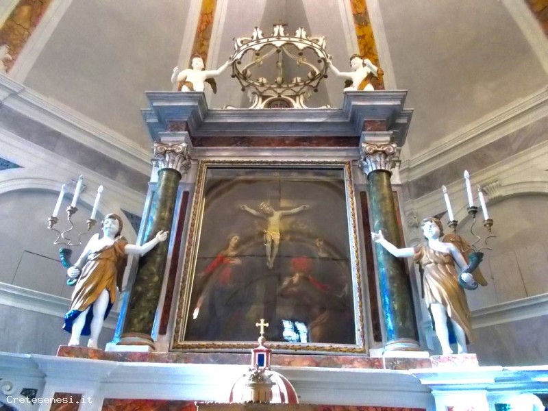 Sull'altare maggiore è un Crocifisso ligneo applicato su una tela con la Vergine, San Giovanni e la Maddalena datato 1657, molto venerato, al quale è dedicata la Festa del Perdono con la processione il primo venerdì di marzo.