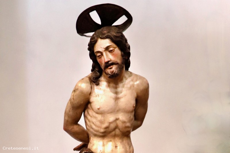 La scultura fu eseguita nel 1617, in concomitanza dei restauri eseguiti nella chiesa e della fondazione della Compagnia della Buona Morte, ad opera dell'intagliatore di Lucignano Niccolò di Smeraldo Salvi e dipinto dal cortonese Michelangelo Busti. Il Salmi situa tali sculture religiose di legno nel ricordo di una tradizione rinascimentale e individua nel naturalismo del Salvi, rispetto ad altri artisti per es. Sallustio Lombardi, un formalismo più accentuato. Non ci sembra che la scultura diverga visibilmente per qualità , dal Cristo Risorto della chiesa del Gesù (1620), come invece evidenzia il Cantelli.