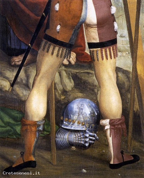 In basso, da notare la resa degli stati d'animo con la Madonna che sviene, sopraffatta dal dolore, ed è assistita dalle pie donne, mentre due soldati (curiosamente uno con un'armatura moderna e l'altro invece con l'armatura da antico romano a testimoniare il grande interesse che il Sodoma aveva per l'antichità classica, sebbene qui non sia molto evidente) osservano tutta la scena.