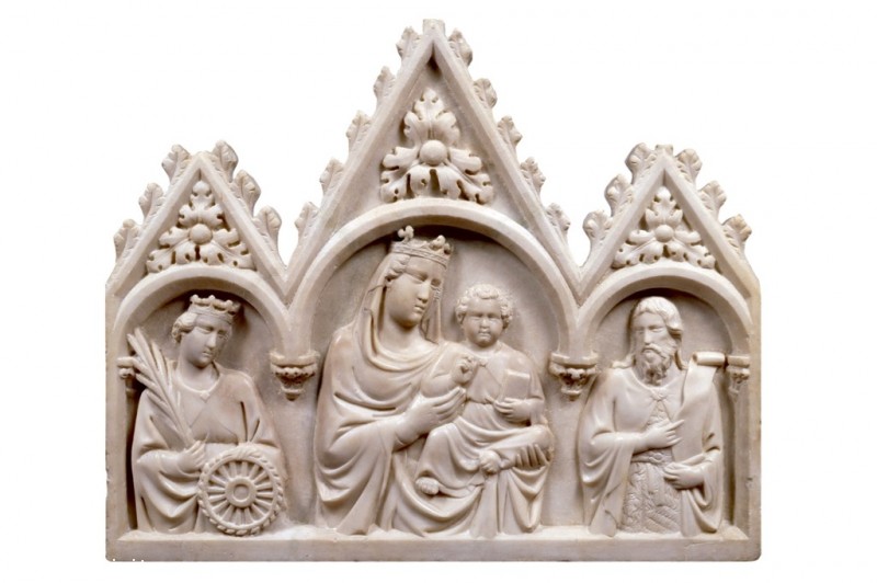 Lo scultore, formatosi nel grande cantiere della cattedrale senese, Tino di Camaino subì il fascino della scultura drammatica ed espressiva di Giovanni Pisano, capomaestro del Duomo di Siena tra il 1284 e il 1297. La meditazione sulle opere del Pisano e il contatto con i ritmi fluidi ed eleganti della pittura di Simone Martini portarono il nostro artista all'elaborazione di un linguaggio estremamente originale, interessato alla trasposizione scultorea degli effetti cromatici e delle forme raffinate della coeva produzione pittorica. La struttura del rilievo e la disposizione delle figure derivano infatti dai trittici realizzati dai grandi maestri del primo Trecento senese: peculiare dell’arte del nostro scultore è la restituzione ampia, dilatata dei volumi delle figure, plasmate in una materia liscia e levigata che esalta la cura e la raffinatezza dei dettagli. Al vigoroso plasticismo dei volti, sottolineato dallo sviluppo potente della robusta mascella, si accompagna il trattamento pittorico della barba di San Giovanni battista e delle capigliature dei sacri personaggi i cui occhi, dall’elegante profilo allungato, rimandano ai raffinati prototipi di Simone Martini.