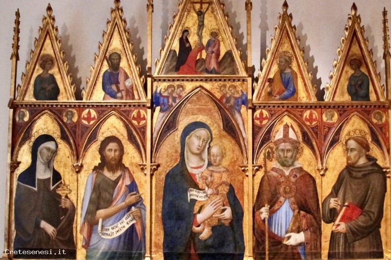 Si presenta distinta in due fasce: in quella inferiore, di maggiori proporzioni, troviamo al centro la Vergine con in braccio il Bambino. Ai suoi lati scopriamo, a sinistra, santa Chiara e san Giovanni Battista mentre, a destra, ci sono le immagini di sant'Agostino e san Francesco d'Assisi. nella fascia superiore, composta da cuspidi, si scopre nella scena centrale la scena del Cristo crocifisso con ai piedi della croce le figure della Madonna, di san Giovanni Evangelista e della santa Maria Maddalena. Nelle altre cuspidi della cimasa sono stati raffigurati quattro santi di difficile interpretazione. Agostino vi è dipinto come vescovo e Dottore della Chiesa: in testa porta la mitra, indossa il piviale e con la mano destra impugna il bastone pastorale. Con la mano sinistra porta al petto un libro rosso chiuso. Il suo viso, abbellito da una folta barba riccioluta, ha un aspetto stereotipato, tipico della pittura del secolo.