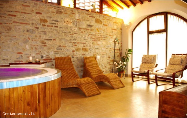 La zona relax mette a disposizione bagno turco, doccia emozionale, vasca idromassaggio, tisaneria, massaggi a base di olio e prodotti naturali ed una piscina esterna bionaturale con vista sulle crete senesi.