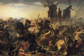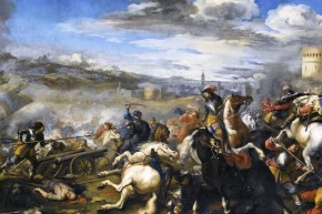 Battaglia con fanteria, cavalleria e cannoni con la città sullo sfondo