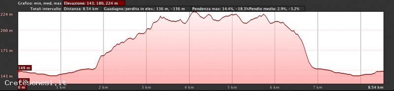 The route of the trail runs along farm roads well maintained and easy to follow. It starts from the Ponte d'Arbia, a rest stop along the ancient Francigena and continue along the right bank of the river, which leaves just after crossing the bridge of the tributary Sorra. The road, after a large curve, goes to Saltennano that appears in a beautiful position on a hilltop. After visiting the complex, you continue to walk uphill along a road lined with cypress trees. We get to St. John in Pompeggiano now known as Ville Petroni, a place surrounded by greenery which offers a splendid view. From here you can continue and turn left towards the farm Lombricaia, from where it returns to the bridge on Sorrae then to Ponte d'Arbia.